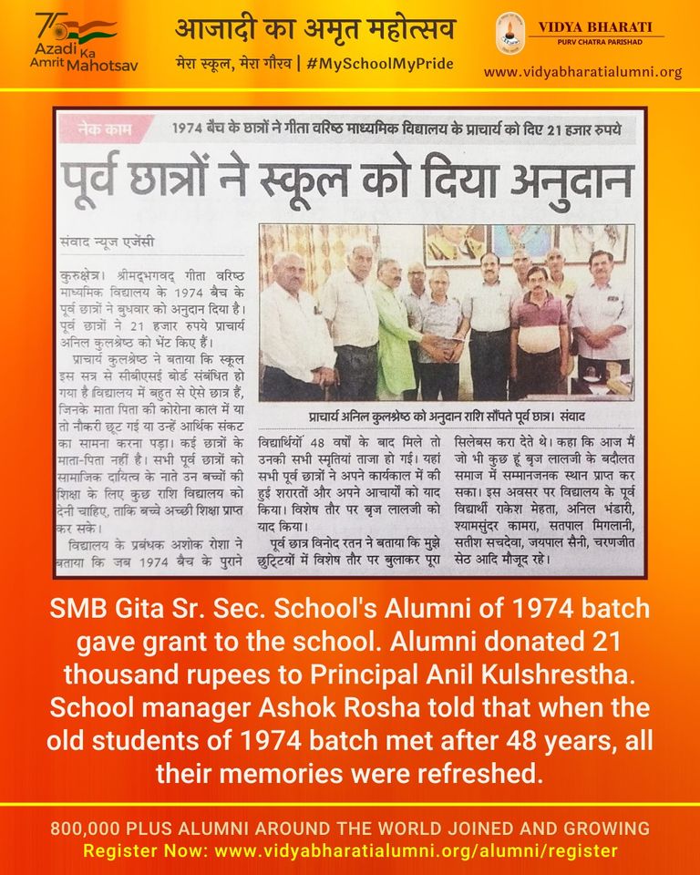 SMB Gita Sr. Sec. School's Alumni of 1974 batch gave grant to the school. Alumni donated 21 thousand rupees to Principal Anil Kulshrestha. School manager Ashok Rosha told that when the old students of 1974 batch met after 48 years, all their memories were refreshed.