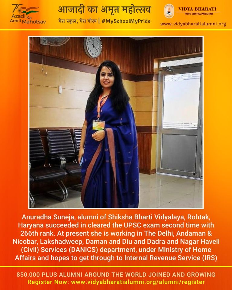 Anuradha Suneja, alumni of Shiksha Bharti Vidyalaya, Rohtak, Haryana succeeded in cleared the UPSC exam second time with 266th rank. At present she is working in The Delhi, Andaman & Nicobar, Lakshadweep, Daman and Diu and Dadra and Nagar Haveli (Civil) Services (DANICS) department, under Ministry of Home Affairs and hopes to get through to Internal Revenue Service (IRS).