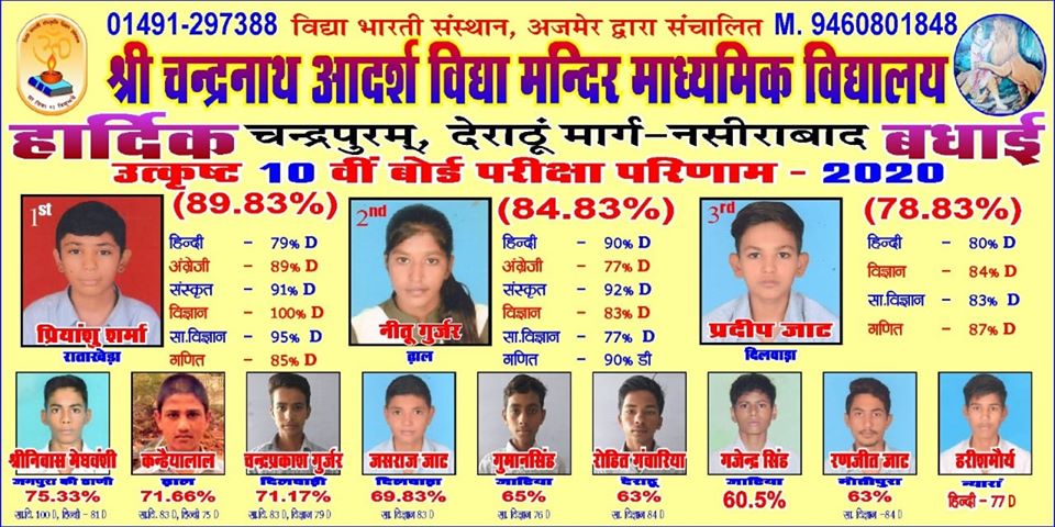 Students of Sh.Chandranath Sec. Adarsh Vidya Mandir, Nasirabad, Ajmer, Rajasthan scored amazing results in 2020 board examinations