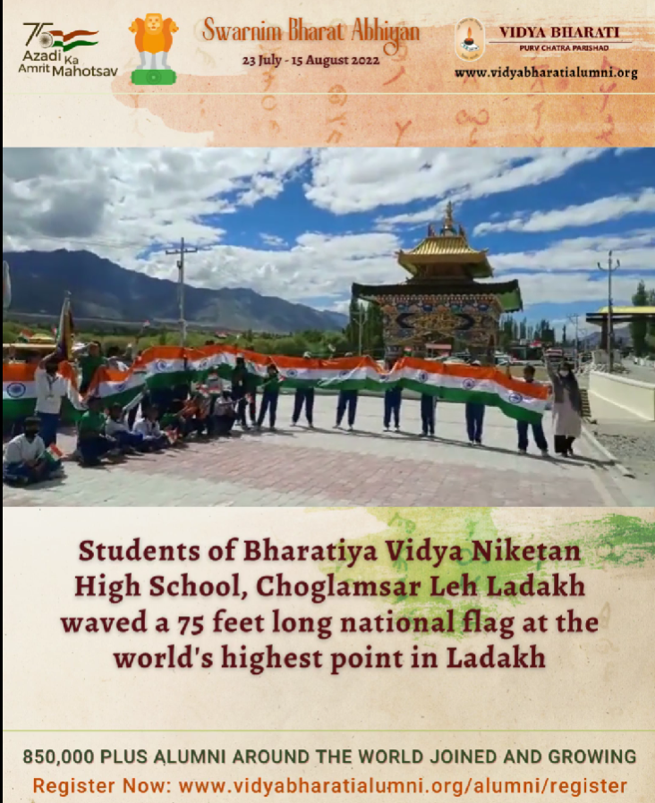 Students of Bharatiya Vidya Niketan High School, Choglamsar Leh Ladakh waved a 75 feet long national flag at the world's highest point in Ladakh.