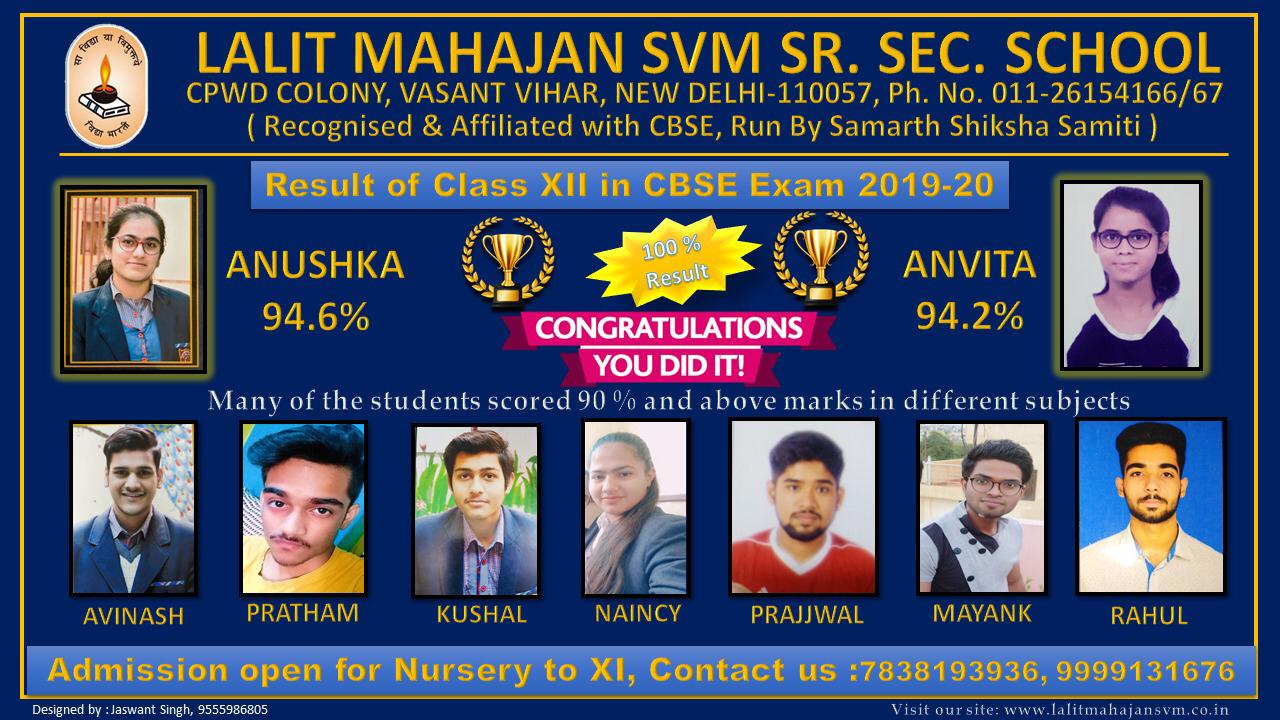 Students of Lalit Mahajan Saraswati Vidya Mandir Sr.Sec. School, Vasant Vihar, Delhi scores more than 90% in class 12 board examinations.