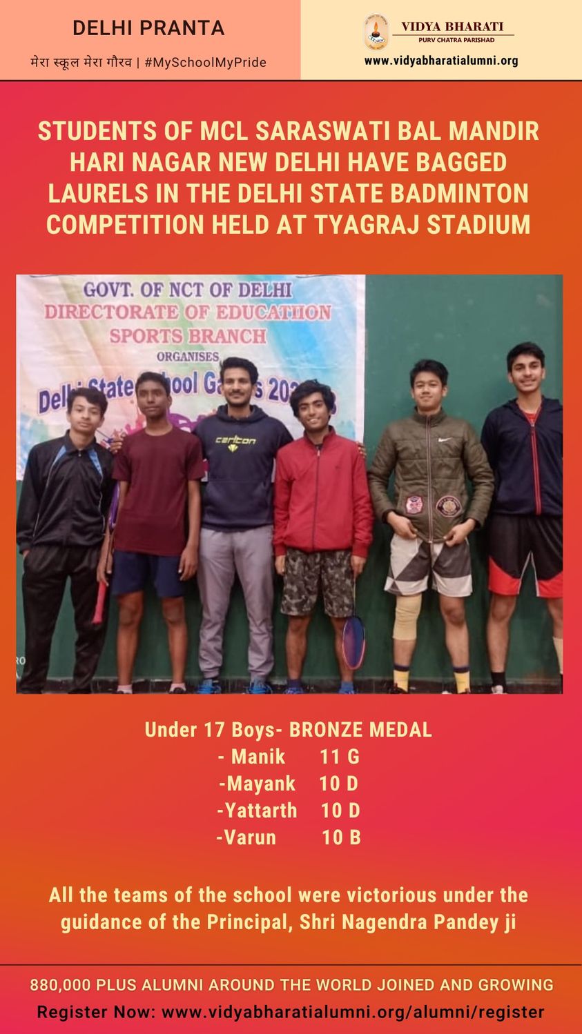 Students of MCL Saraswati Bal Mandir Hari Nagar New Delhi have bagged laurels in the Delhi State Badminton Competition held at Tyagraj Stadium