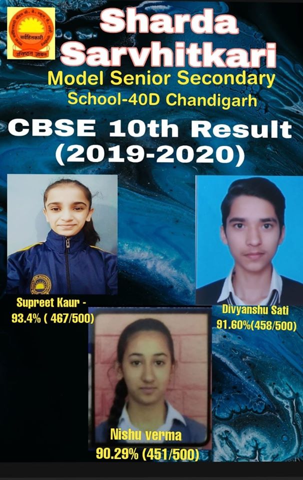 Three students of Sharda Sarvhitkari Model Sen Sec. School, Sector 40-D Chandigarh, Punjab scores more than 90% in class 10 examinations
