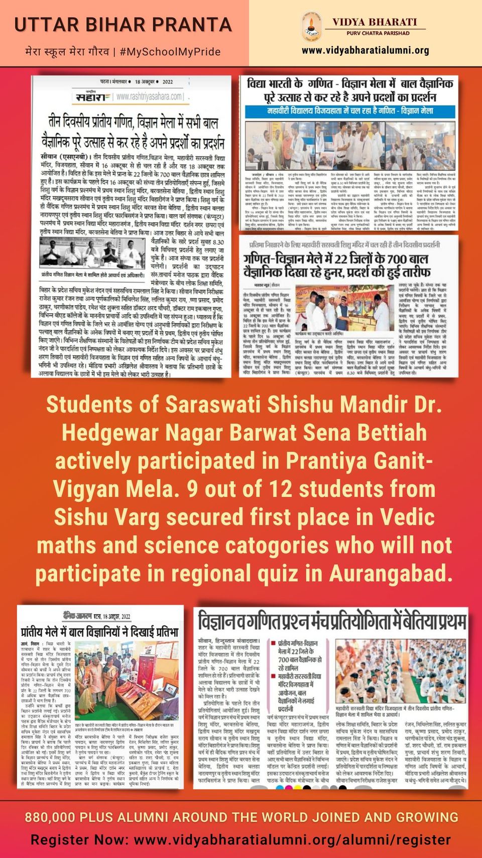 Students of Saraswati Shishu Mandir Dr. Hedgewar Nagar Barwat Sena Bettiah actively participated in Prantiya Ganit-Vigyan Mela. 9 out of 12 students from Sishu Varg secured first place in Vedic maths and science catogories who will not participate in regional quiz in Aurangabad.