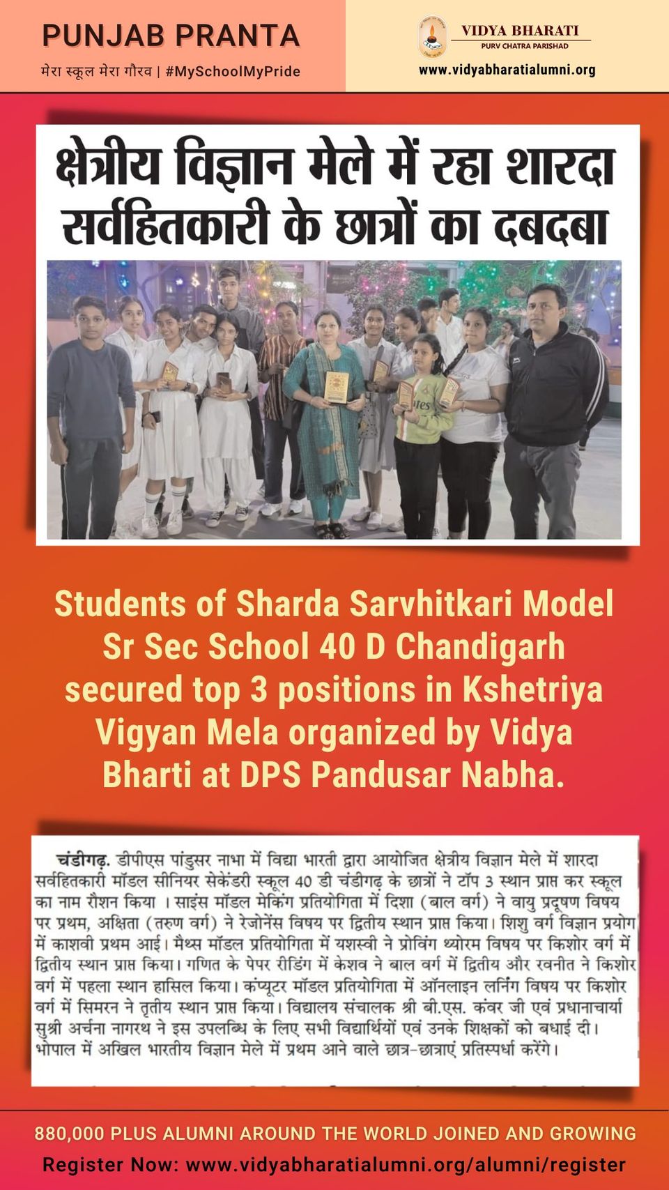 students of sharda sarvhitkari model sr sec school 40 d chandigarh secured top 3 positions in kshetriya vigyan mela organized by vidya bharti at dps pandusar nabha.