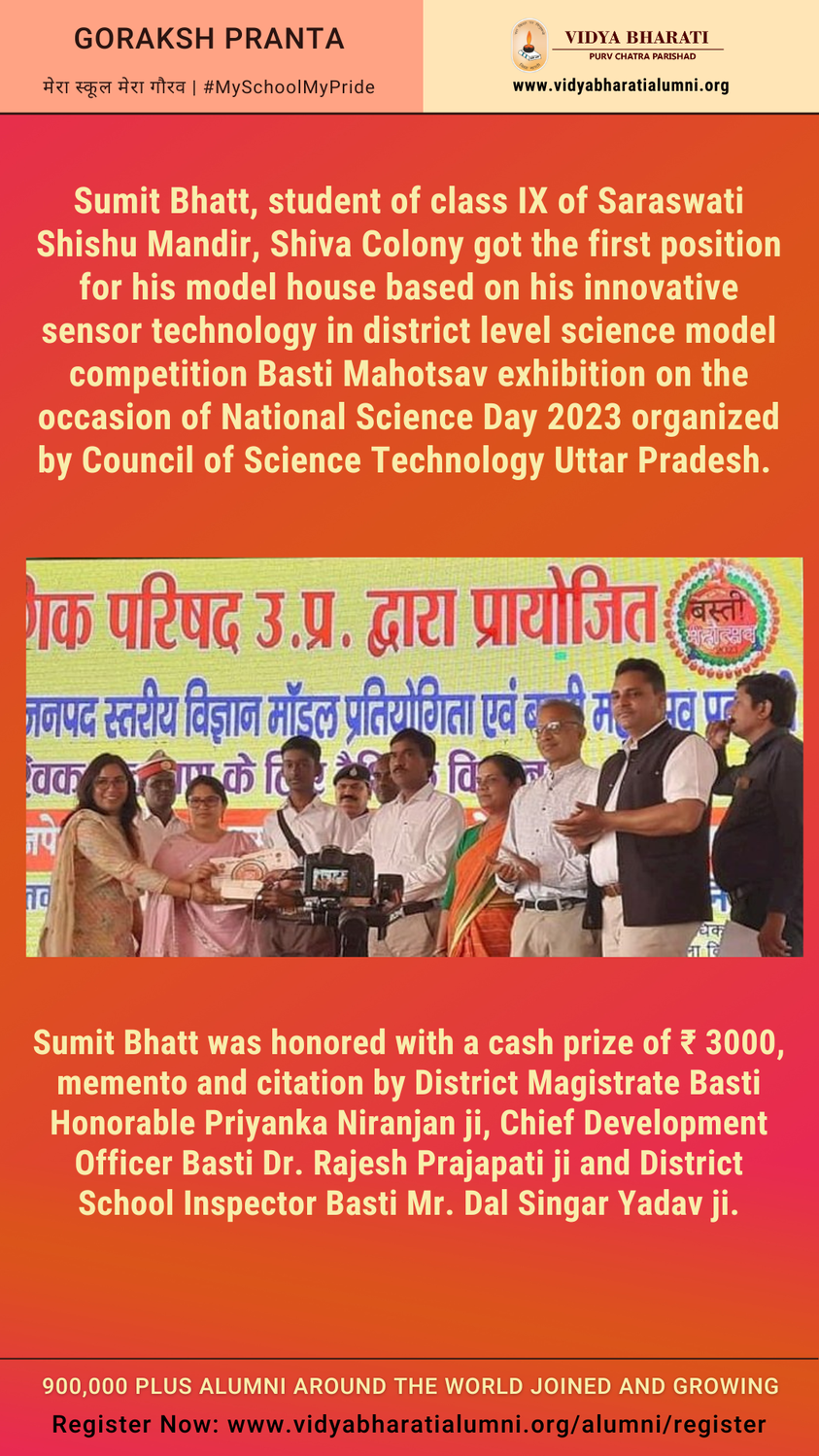 Sumit Bhatt was honored with a cash prize of ₹ 3000, memento and citation by District Magistrate Basti Honorable Priyanka Niranjan ji, Chief Development Officer Basti Dr. Rajesh Prajapati ji and District School Inspector Basti Mr. Dal Singar Yadav ji.