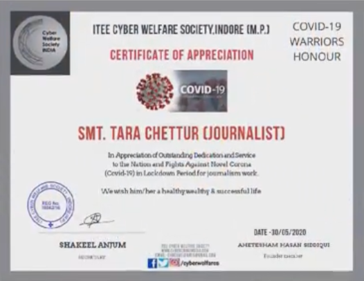 Tara Chettur, alumni of Vyasa Vidya Peethom, Kallakked, Palakkad, Kerala and a journalist has been honoured by Welfare Society India (MH), in appreciation of her outstanding dedicated service to the Nation and fight against Novel Corona (Covid 19) during lockdown period for journalism work.