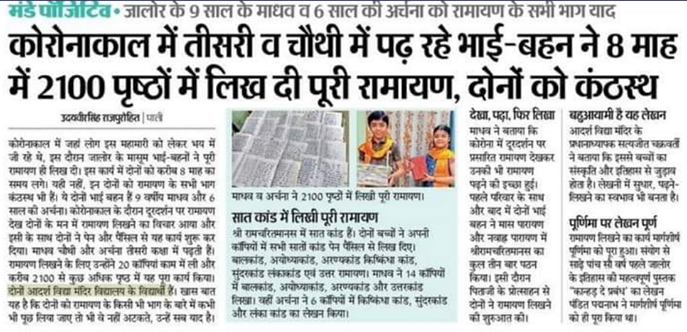 विद्या भारती के आदर्श विद्यामंदिर, जालोर के चौथी कक्षा के दो विद्यार्थीयों (भाई -बहन ) ने 8 माह मे 2100 पृष्ठों मे लिख दी पूरी रामायण । प्रयोग धर्मी शिक्षक संदीप जी जोशी के गुणवान पुत्र व पुत्री । विद्या भारती के विद्यालयों से मिलने वाले संस्कारों का प्रत्यक्ष प्रकटीकरण।