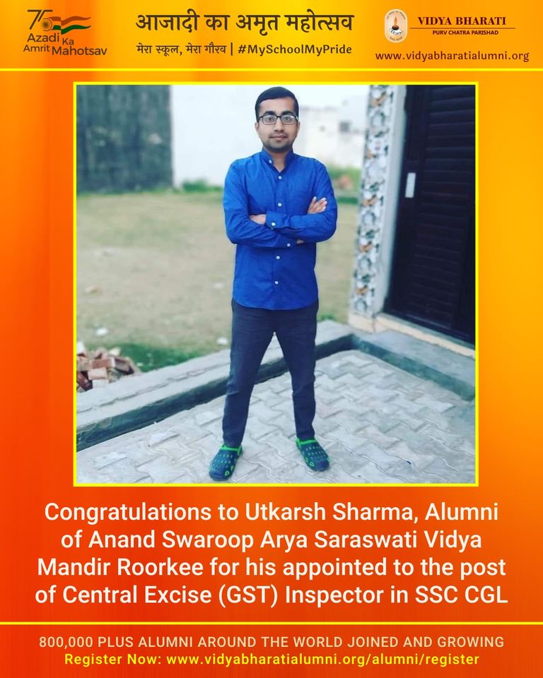 Congratulations to Utkarsh Sharma, Alumni of Anand Swaroop Arya Saraswati Vidya Mandir Roorkee for his appointed to the post of Central Excise (GST) Inspector in SSC CGL.