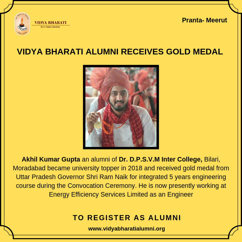 Akhil Kumar Gupta an alumni of Dr. D.P.S.V.M Inter College, Bilari in Moradabad , UP has always been a hardworking student with clear ambitions. He was a volunteer of disciplinary committee in his school and proactively participated in various cultural activities organized by Vidya Bharati. According to him these experiences helped him to hone his marketing and leadership skills. In College, he became the marketing manager of entrepreneurship cell where he worked on promoting business strategies to fellow students.