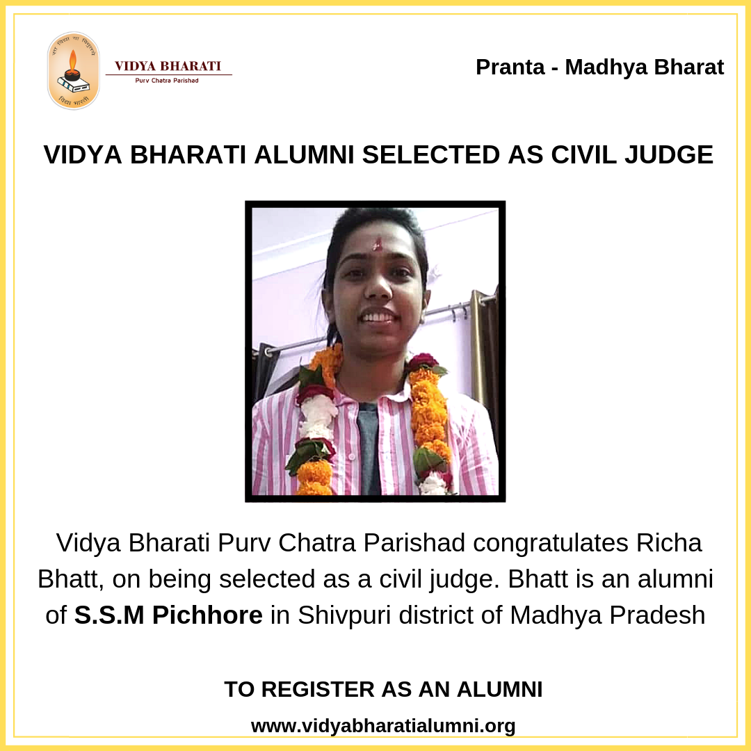 Vidya Bharati alumni Richa Bhatt,got appointed as a civil judge. Bhatt is an alumni of S.S.M Pichhore in Shivpuri district of Madhya Pradesh