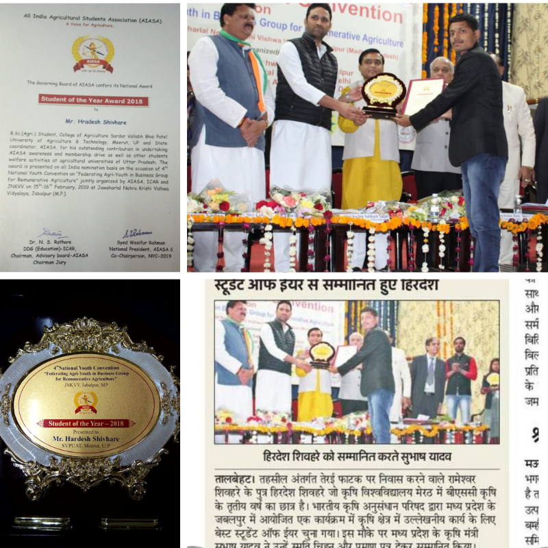 Vidya Bharati alumni, Hradesh Shivhare was awarded ' Student of the Year 2018 ' by Sachin Subhash, Agriculture Minister of Madhya Pradesh.