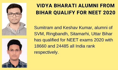 Sumitram and Keshav Kumar, alumni of SVM, Ringbandh, Sitamarhi, Uttar Bihar has qualified for NEET exams 2020 with 18660 and 24485 all India rank respectively.