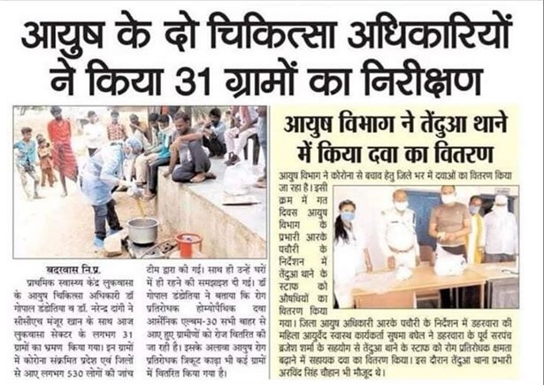 Dr Gopal Dandotia (AYUSH DOCTOR) posted at Primary Health center Lukwasa and alumni of Saraswati Vidyapeeth Awasiya Vidyalaya, Shivpuri, visited 31 villages making them aware preventative measures to be followed during pandemic and distributed homeopathy medicines.