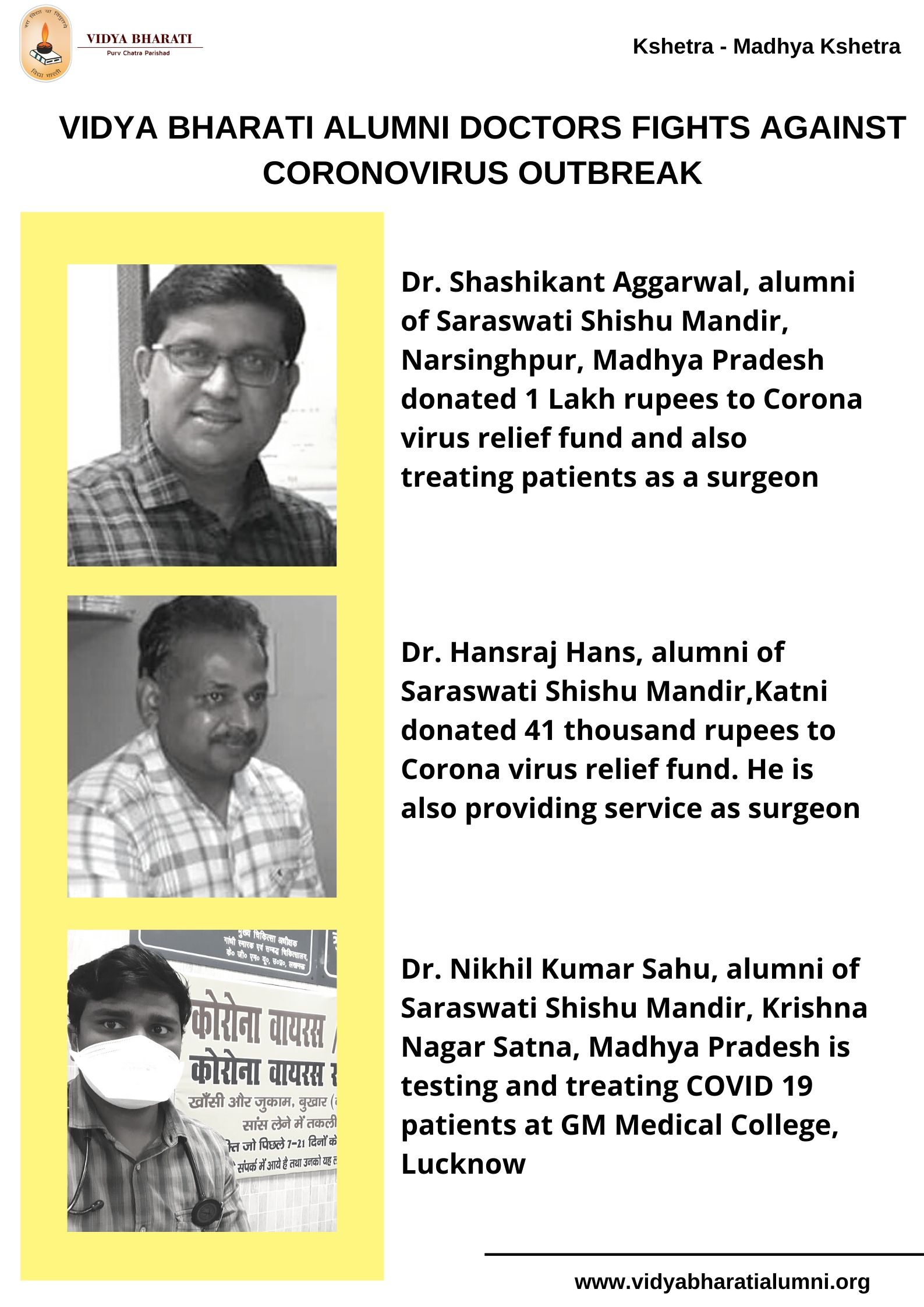 Dr. Shashikant Aggarwal, alumni of Saraswati Shishu Mandir, Narsinghpur, Madhya Pradesh donated 1 Lakh rupees to Corona virus relief fund and also treating patients as a surgeon.
