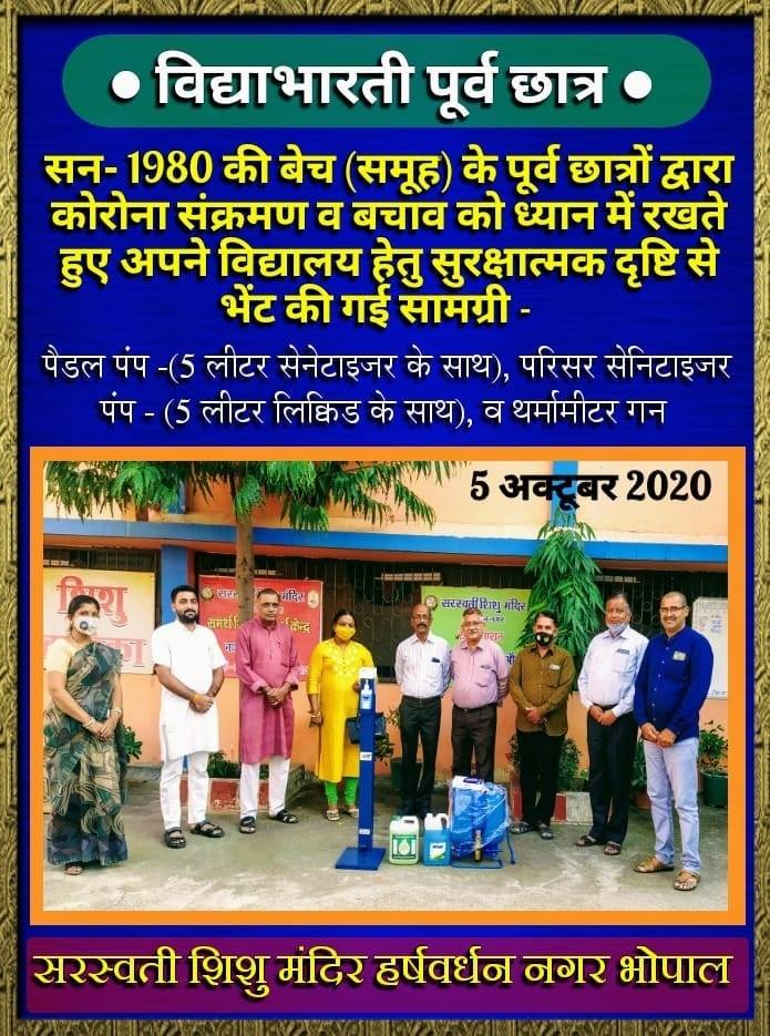 Vidya Bharati alumni of Saraswati Shishu Mandir Harshavardhan Nagar, Bhopal (1980) batch donated safety equipment such as Sanitizer Pump, hand sanitizers, thermometer gun etc to their school in order to help the school administration to keep safe during the Covid 19 pandemic