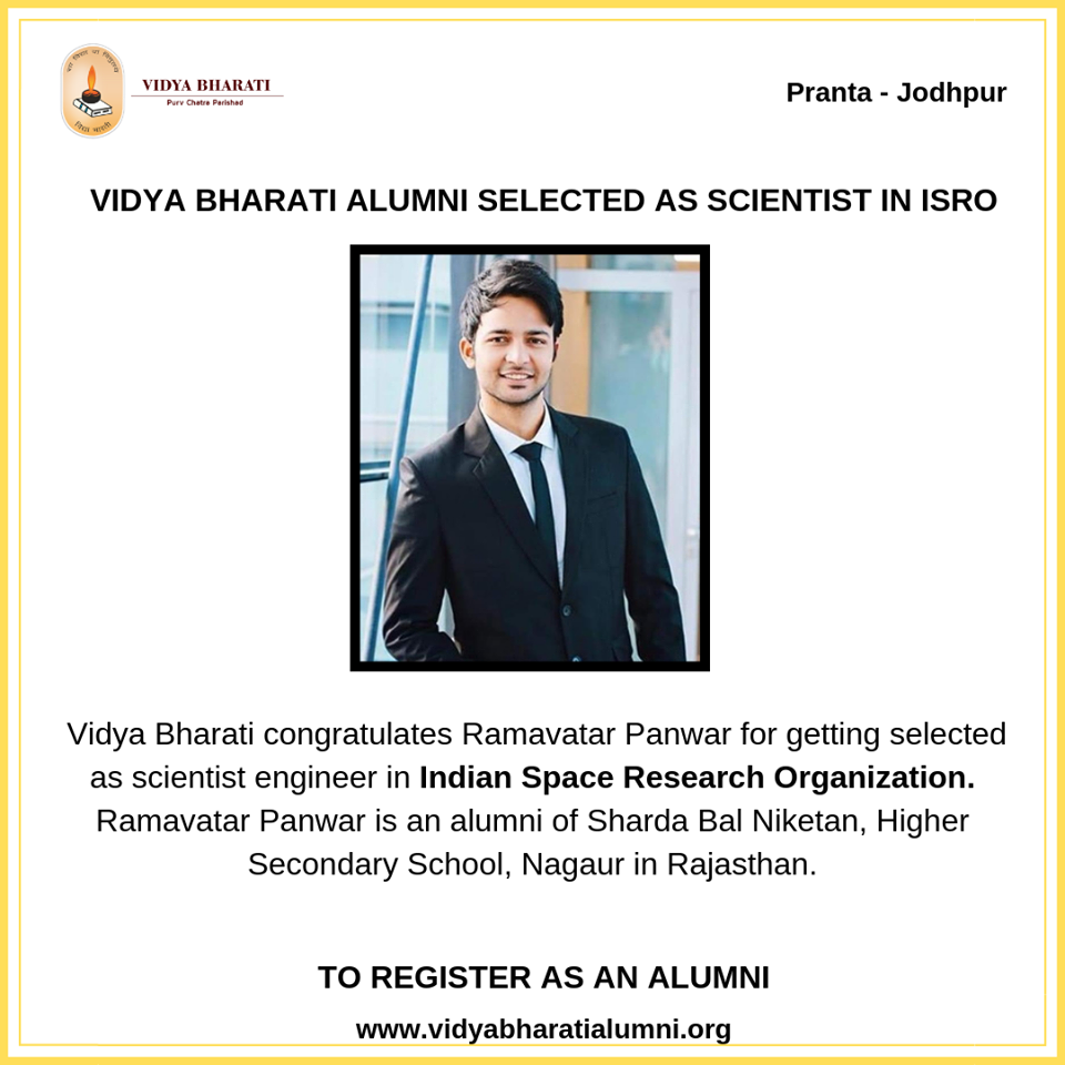 Vidya Bharati congratulates Ramavatar Panwar for getting selected as scientist engineer in Indian Space Research Organization. Ramavatar Panwar is an alumni of Sharda Bal Niketan, Higher Secondary School, Nagaur in Rajastan.