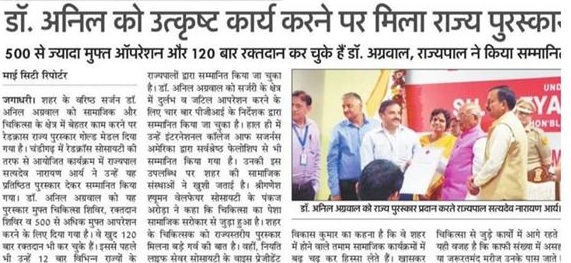 Vidya Bharati alumni,Dr Anil Aggarwal, who is a famous surgeon was honored with 'State Award' by Governor of Haryana for his extraordinary work and social service.He has done more than 500 operations for free and donated blood 120 times.He has been honored 12 times by different States for his passionate work.