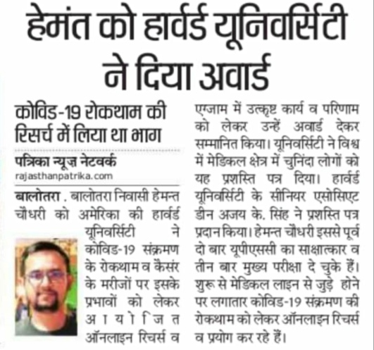 Alumni of Adarsh Vidya Mandir Sr. Sec. School, Majiwala, Rajasthan, Hemant Choudhary, was honoured by Harvard University of America with an award for outstanding work in online exams for prevention of Covid-19 infection.