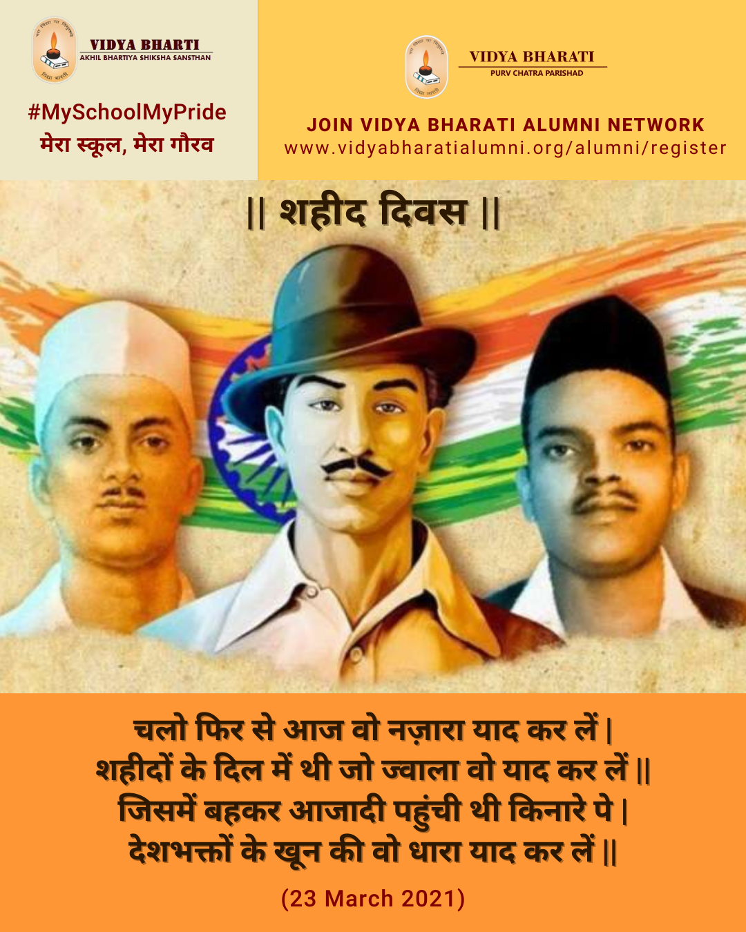 In remembrance of Bhagat Singh, Rajguru and Sukhdev and as a support toward the nation, let us join the Vidya Bharati Alumni Network.