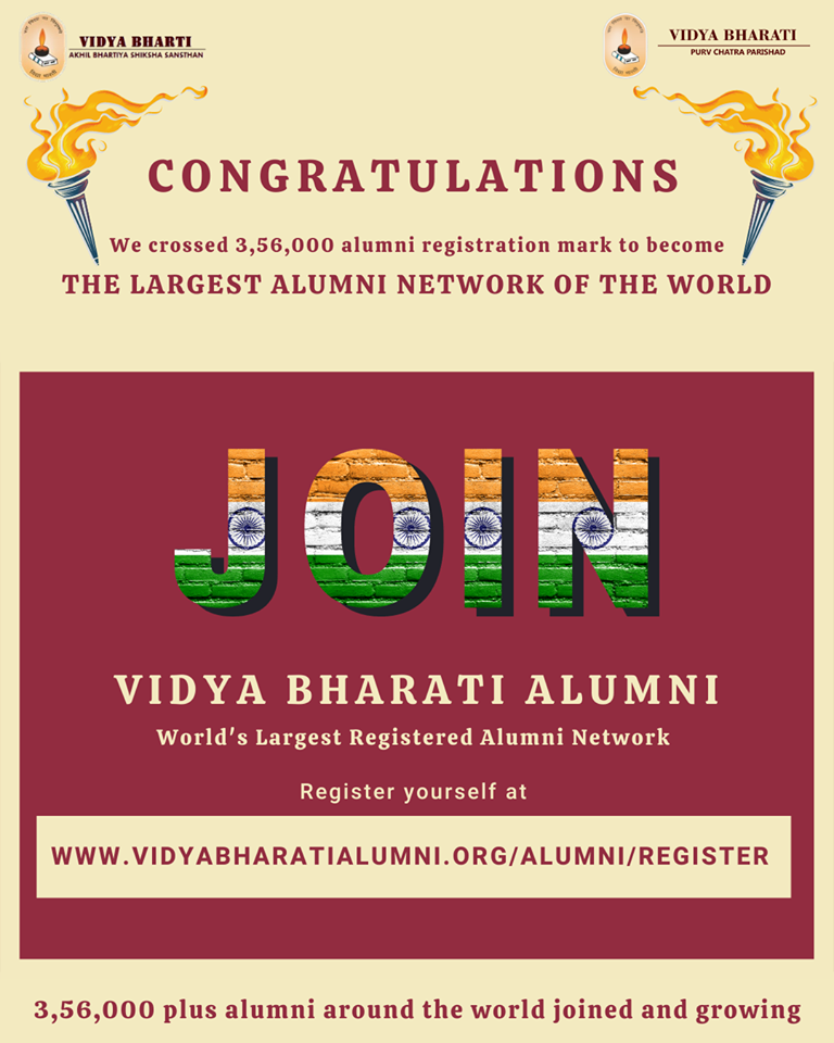 Vidya Bharati Alumni Network crossed 3 lakh, 56 thousand mark by which it becomes the largest registered Alumni Network in the world. It is a historic moment and Vidya Bharati Alumni is thankful to the entire Vidya Bharati Parivar