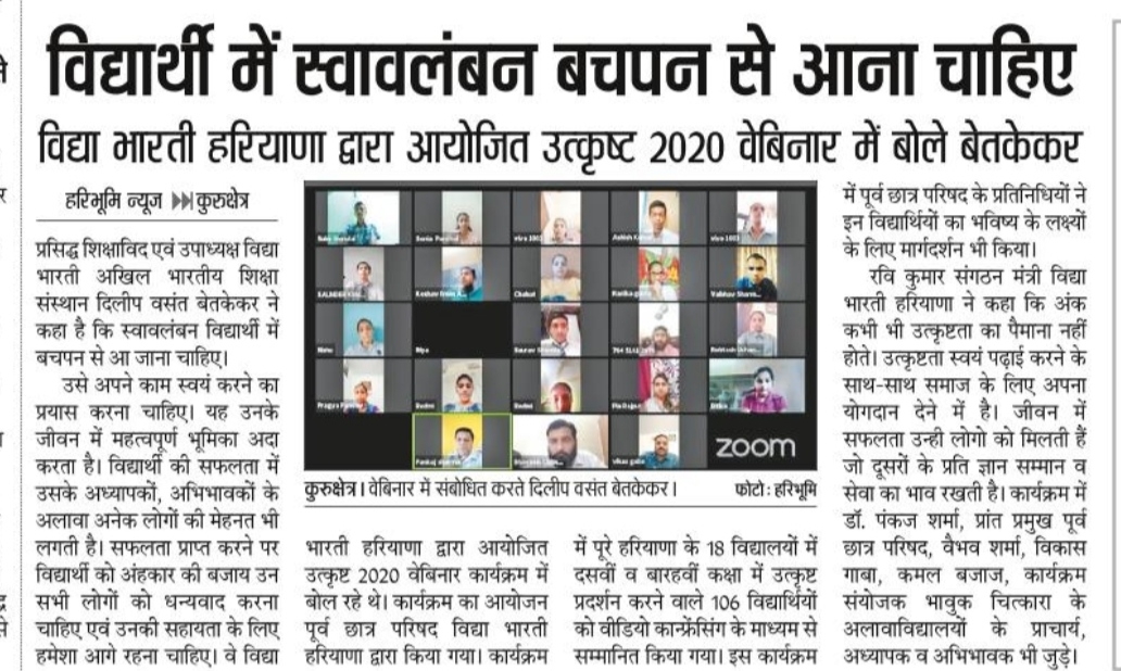 106 meritorious students from Haryana who had secured good results in their 10th and 12th board examinations were honored via video conferencing. Vidya Bharati National Vice President Shri. Dilip Betkekar, Shri Vijay Nadda (Uttar Kshetra Sangathan Mantri) and Sri Ravi Ji (Sangathan Mantri, Haryana) was present during the event.
