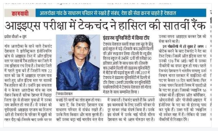 Tekchand Deshwal of village Aldoka has glorified the name of his district by getting the seventh rank in the All India level in the IES Test from Indian Electrical Engineering Branch.
