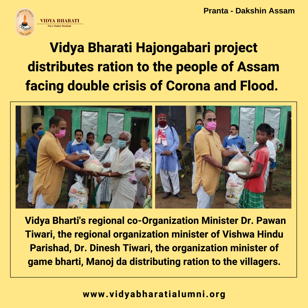 At a time when thousands of poeple have been left homeless due to heavy rain and flood in Assam, causing villages to remain submerged under water, Vidya Bharati Hajongabari project helps people of Assam with ration to fight double crisis of Corona and Flood. Vidya Bharti's regional co-Organization Minister Dr. Pawan Tiwari, the regional organization minister of Vishwa Hindu Parishad, Dr. Dinesh Tiwari, the organization minister of game bharti, manoj da helped the villagers.