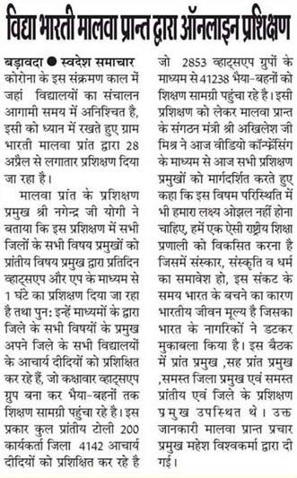 Since the country wide lockdown due to Covid 19 pandemic, Vidya Bharati Malwa, has been providing online training to teachers belonging to rural areas, so that they can be updated with latest technologies and teach their students digitally. Due to this effort approximately 41238 Vidya Bharati rural students in Malwa has been receiving education online. Also more than 4142 teachers have been trained till now.