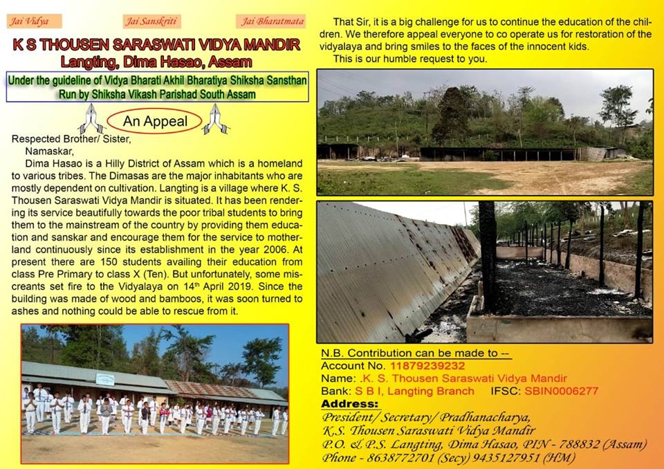 Vidya Bharati school Thousen Saraswati Vidya Mandir in Dima Hasao has been destroyed by fire and appealed for help to rebuild it.