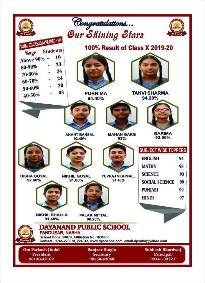 Dayanand Public School, Nabha, Punjab secured 100% pass out results in class 10 board examinations