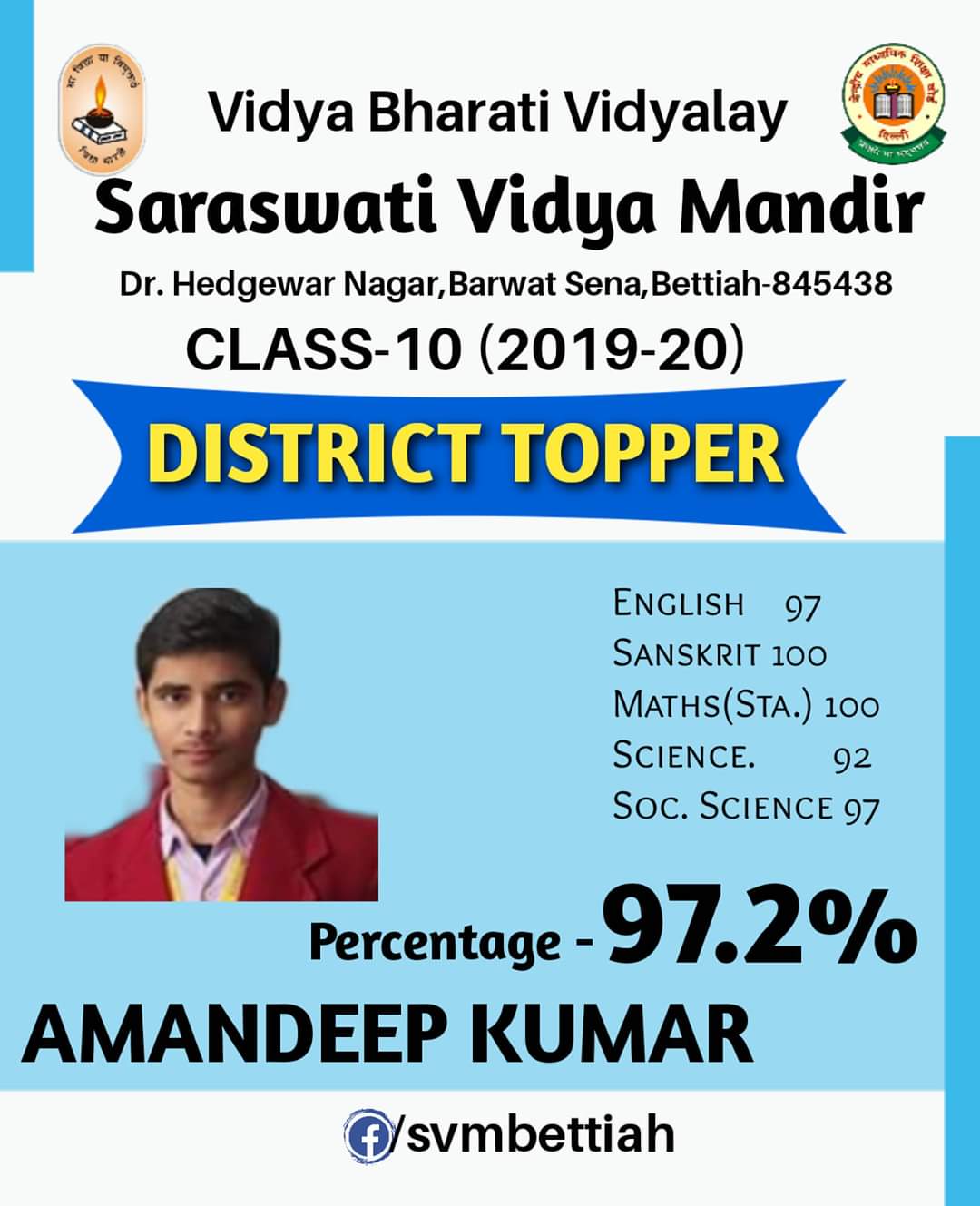 Amandeep Kumar, student of Saraswati Vidya Mandir Primary Dr. Hedgewar Nagar Barwat Sena Bettiah, became district topper by scoring 97.2 percent in class 10 board examinations.