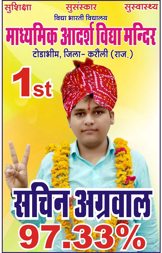 Sachin Aggarwal of Secondary Adarsh Vidya Mandir Todabhim, Jaipur scores 97.33% marks, in class 10 board exam.
