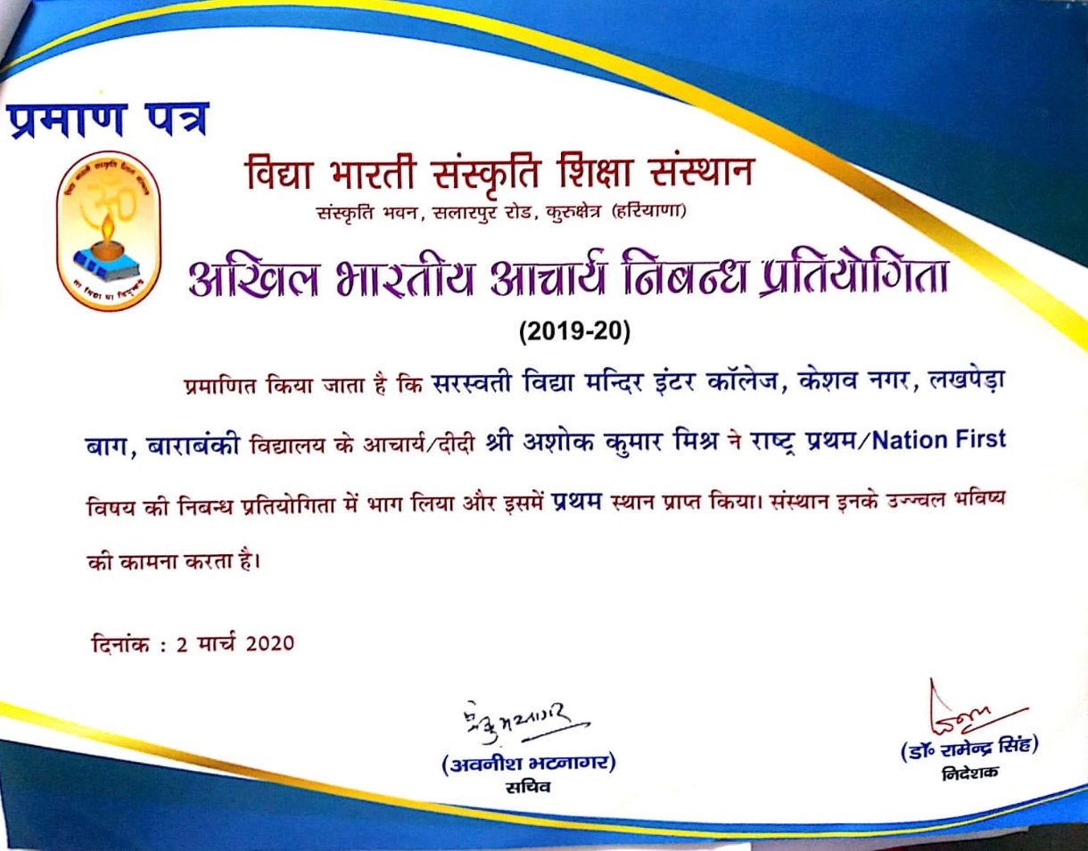 Ashok Kumar Mishra attained 1st place in All India Acharya Essay Competition 2019-2020 organised by Vidya Bharati Sanskriti Shikshan Sansthan. He is a teacher of Saraswati Vidya Mandir Inter College, Keshav Nagar Lakhperabagh Barabanki.