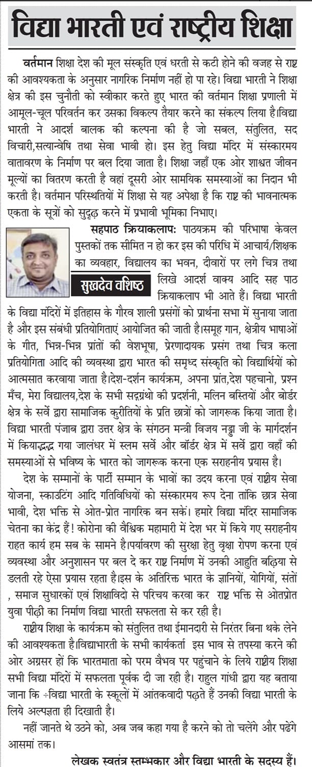 The Hindu covered a news coverage on Vidya Bharati's contribution towards the development of national education.