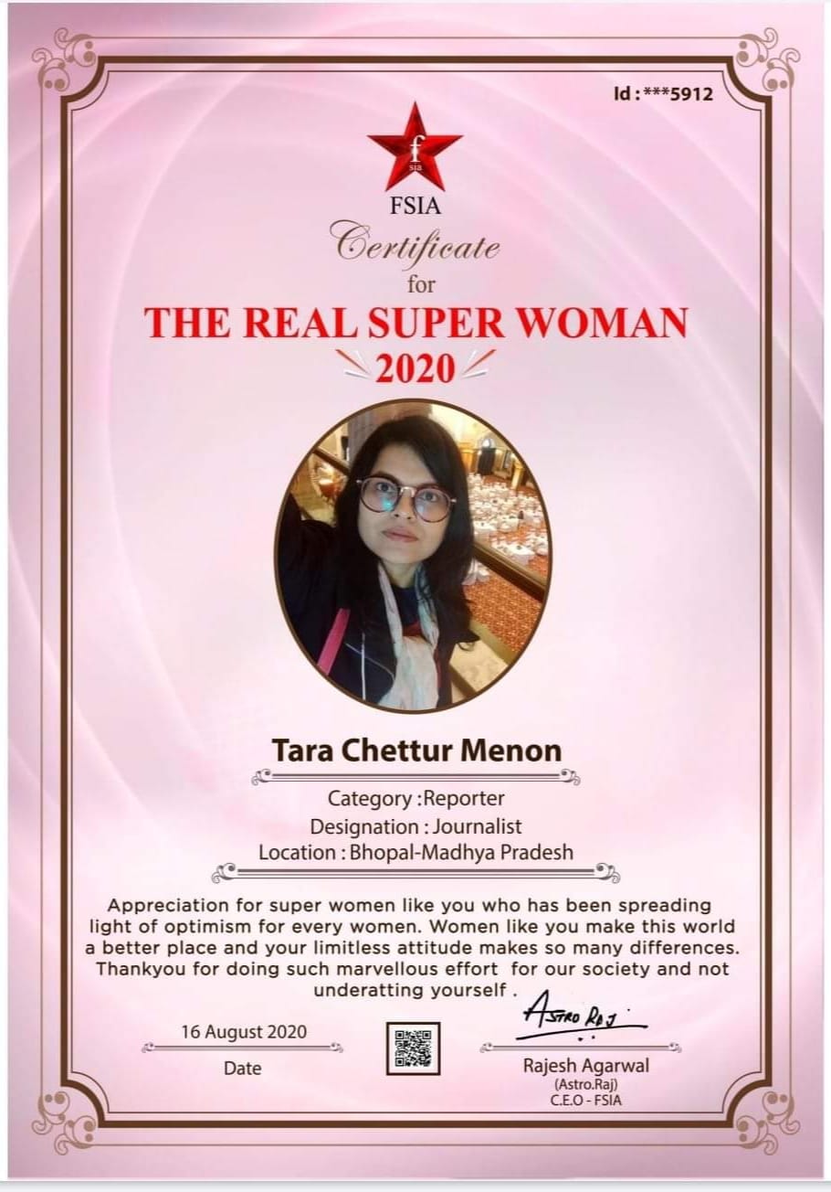 Tara Chettur, alumni of Vyasa Vidya, Peethom Palakked, was honoured by 'FSIA THE REAL SUPER HEROES AWARDS'2020, which is India's one of the biggest platform.